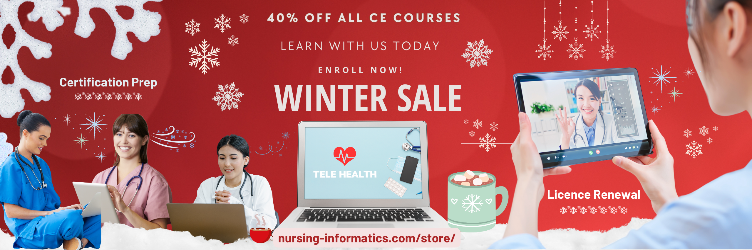 Let us help you to weather these days of winter with our 40% off all courses Winter Sale! The gift of learning can be the perfect remedy for the winter blues for your loved one, your friend, your employee, or yourself – the perfect time to buckle down and earn CE credits and actually learn about the topic at the same time!!! Earn required CE credits for license renewal or certification plus increase knowledge and skills in the fascinating realm of nursing informatics!